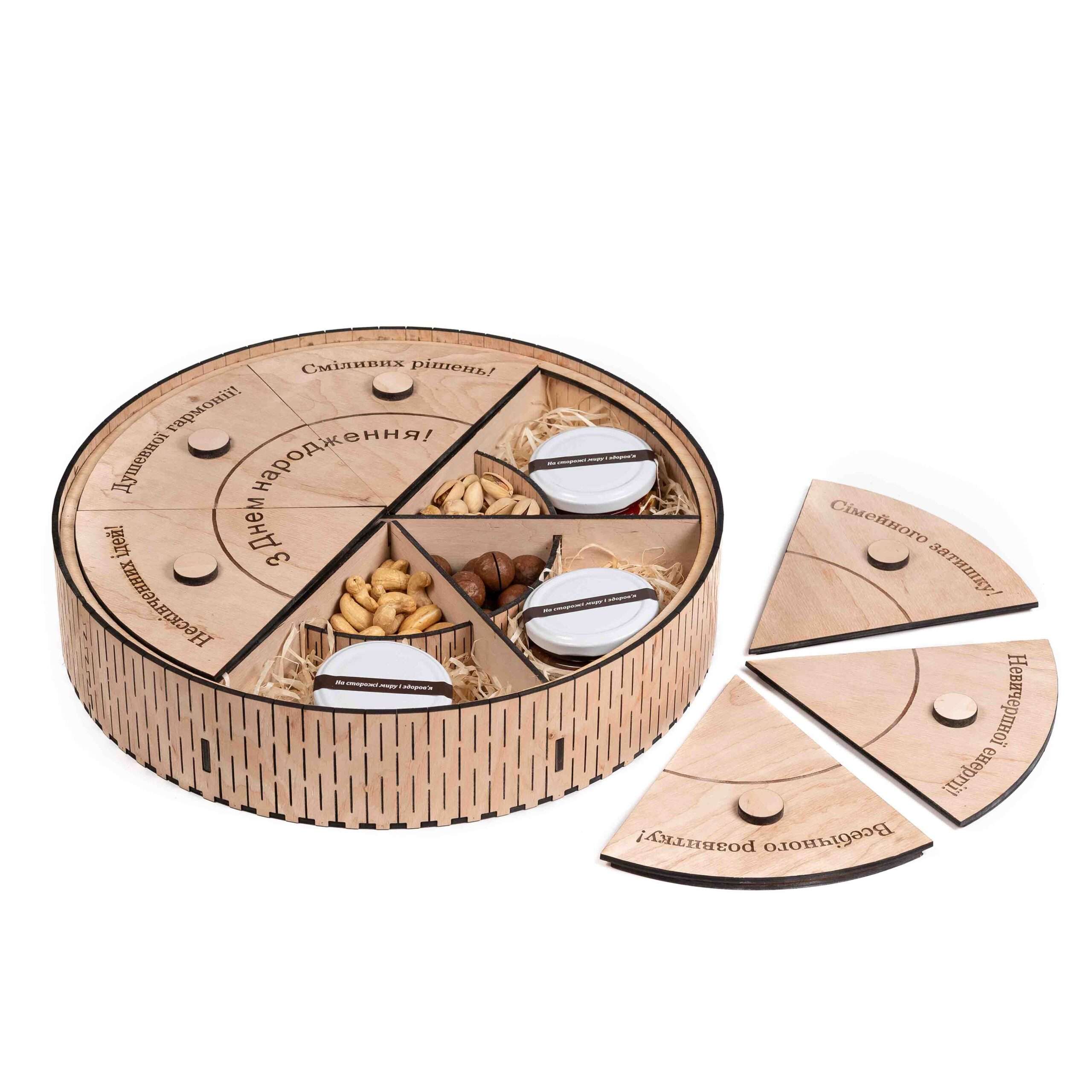 Дерев’яна коробка (діаметр – 35 см, висота – 8 см) з окремими віконцями